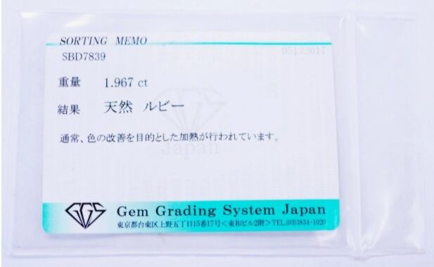 【ソーティング付】【1.967ct】 天然ルビー ルース(裸石) オクタゴンカット