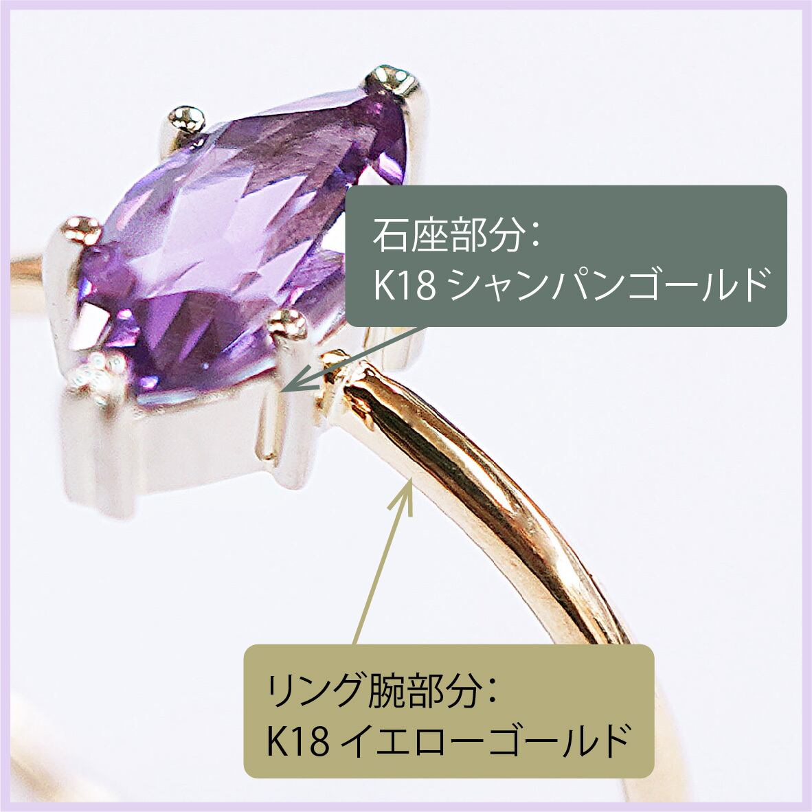 ◆1点限定◆サイズ直し無料 【K18】 シャンパンゴールド×イエローゴールド マーキスカット アメシストリング