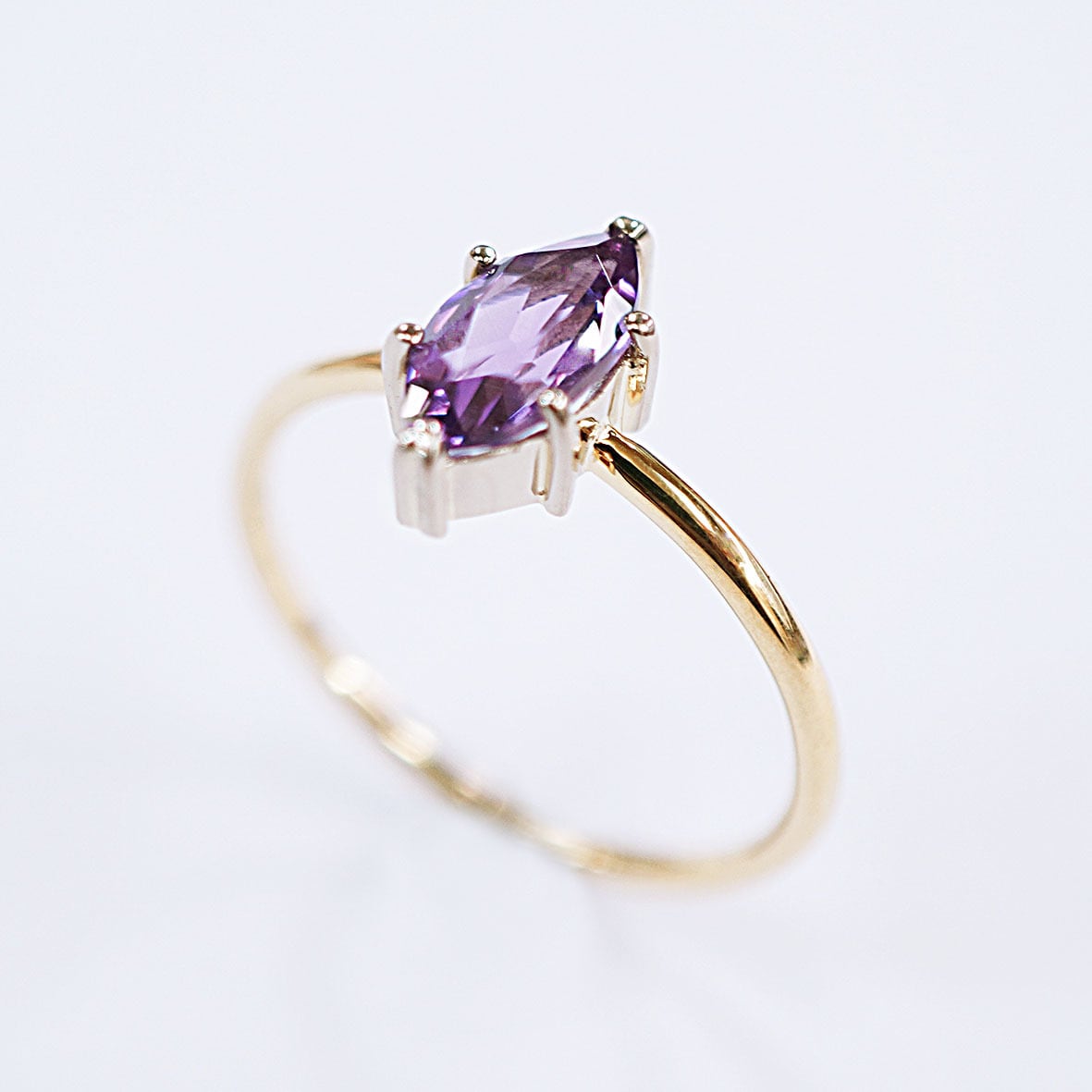 シャンパンゴールドの石座でアメシストの透明感が引き立ち、シャープなラインが指先を綺麗に魅せてくれます。
